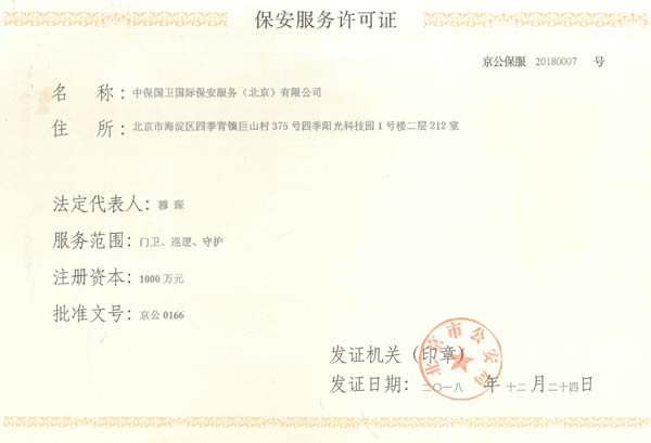中保國衛(wèi)國際保安服務(wù)(北京)有限公司,屬中保國衛(wèi)集團(tuán)旗下子公司。能全方位的為大型客戶提供優(yōu)質(zhì)的安保、押運服務(wù),是集人防和技防于一體的新型正規(guī)化綜合安保押運服務(wù)企業(yè),提供人防、物防、技防、聯(lián)網(wǎng)報*、非武裝押運等安防相關(guān)的一站式服務(wù)。 公司在國內(nèi)多省設(shè)立有分公司及分支機(jī)構(gòu),著重提升安全押運、智能技術(shù)押運及安全技術(shù)防范相關(guān)的服務(wù),業(yè)務(wù)范圍覆蓋全國一、二線城市、港澳地區(qū)以及海外地區(qū)。安保方面主要為政府機(jī)構(gòu)、金融機(jī)構(gòu)、企事業(yè)單位、醫(yī)療衛(wèi)生、高等院校、工業(yè)園區(qū)、大型商場、高檔住宅、智能商務(wù)樓、大型活動提供門衛(wèi)、守護(hù)、巡邏、押運(非武裝)、安全檢查、保安特勤、私人護(hù)衛(wèi)、消防中控、安全技術(shù)防范、遠(yuǎn)洋護(hù)航等全方位服務(wù),同時面向國際市場,為中資企業(yè)在“一帶一路”沿線國家投資提供境外安保服務(wù)。 >> 更多內(nèi)容 |